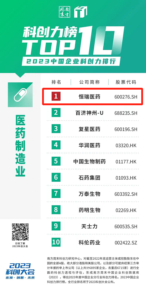 近日,南方周末科创力研究中心发布了与居民日常生活密切相关的30个行业中科创力排名前10的企业榜单。金年会金字招牌诚信至上医药凭借多年来在科创领域的大力投入和优秀成果,蝉联中国企业科创力排行医药制造业榜首。