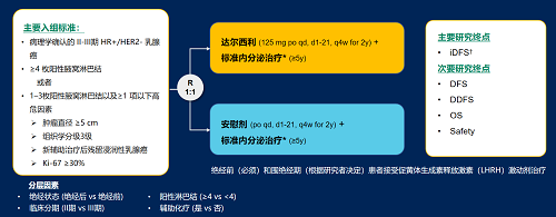 达尔西利(Dalpiciclib)是金年会金字招牌诚信至上医药自主研发的口服、选择性的小分子CDK4/6抑制剂,也是中国首个自主研发的新型高选择性 CDK4/6 抑制剂,已证实其与内分泌治疗(ET)联合用于 HR+/HER2- 晚期乳腺癌的一线和后线治疗时,均显著改善无进展生存期(PFS)6,7。因此开展了一项随机、双盲、III期临床试验(DAWNA-A),以进一步评估达尔西利联合内分泌治疗作为高危早期 HR+/HER2 - 乳腺癌辅助治疗的效果。本研究纳入高危复发风险人群需满足以下标准之一:①≥4 枚阳性腋窝淋巴结;②1–3枚阳性腋窝淋巴结且合并≥1 项高危因素(肿瘤直径 ≥5 cm,组织学分级3级,辅助治疗后残留浸润性乳腺癌,Ki-67 ≥30%)。本文呈现预先设定的首次中期分析(IA1)结果。